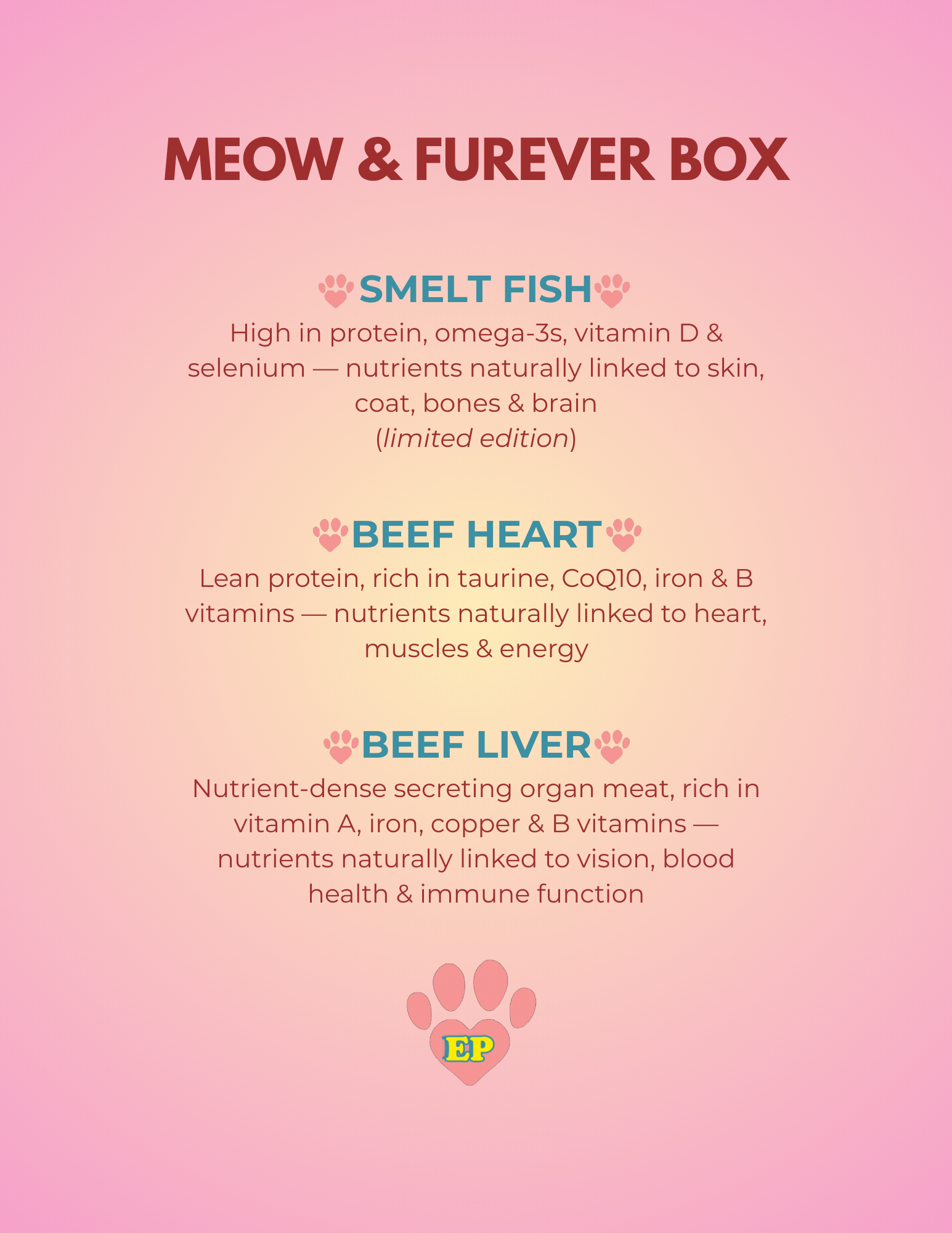 Made with love, intention, and respect for a species-appropriate diet. The Meow & Furever Box brings together three unique, nutrient-dense toppers selected to complement any feeding style, whether you feed raw, gently cooked, or kibble.