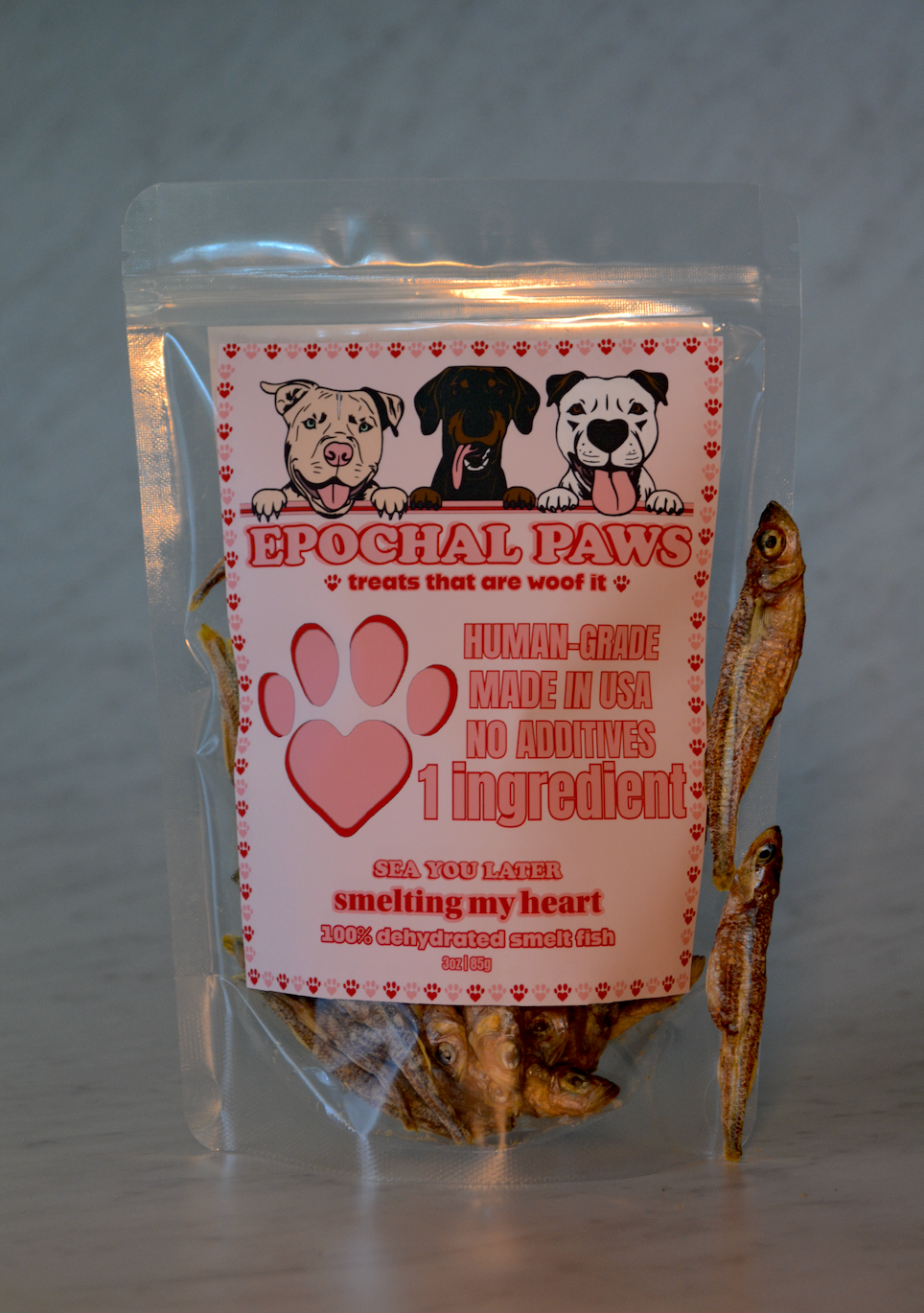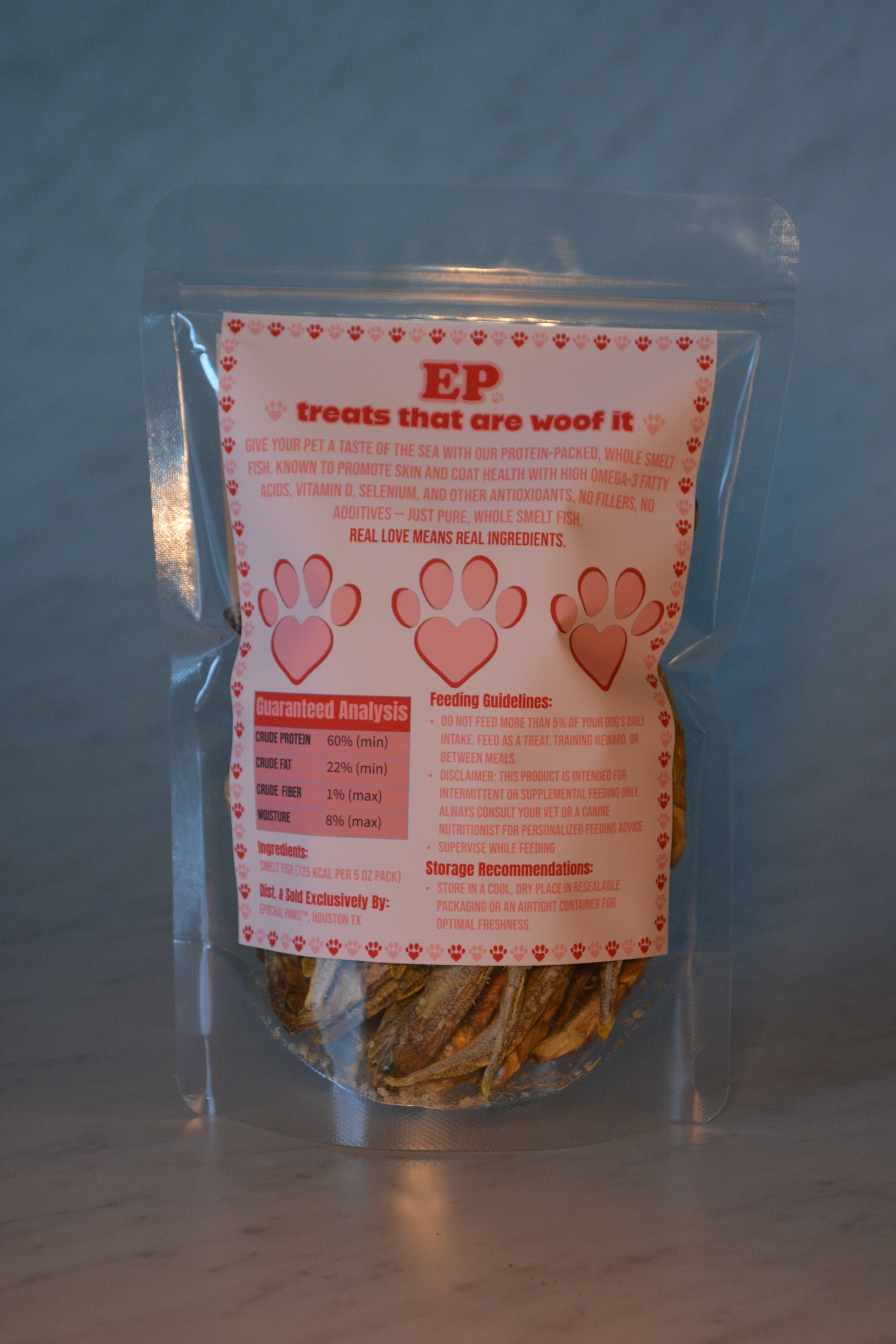 Whole smelt fish are high in protein, omega-3 fatty acids, vitamin D, selenium, and other trace minerals. A great way to boost nutrition; commonly associated with skin and coat, brain function, and bone health. Purfect for dogs or cats.
